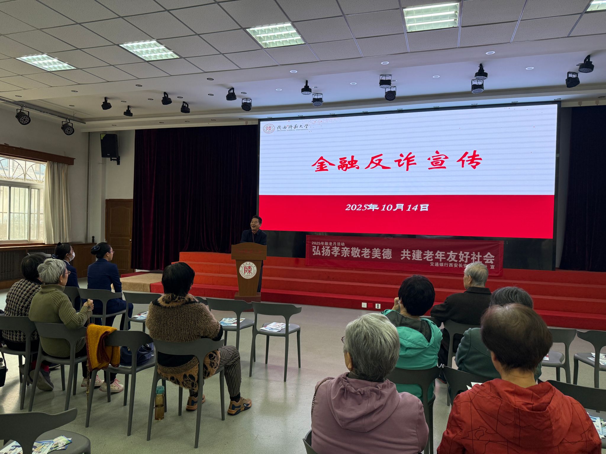 10月14日下午,离退休职工工作处联合交通银行长安南路支行在雁塔校区老年活动中心开展了金融反诈宣传活动,50余位退休人员参会,副处长崔创主持活动。