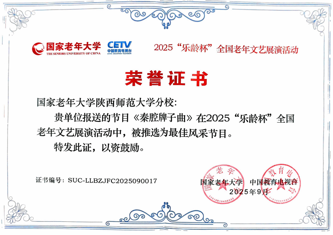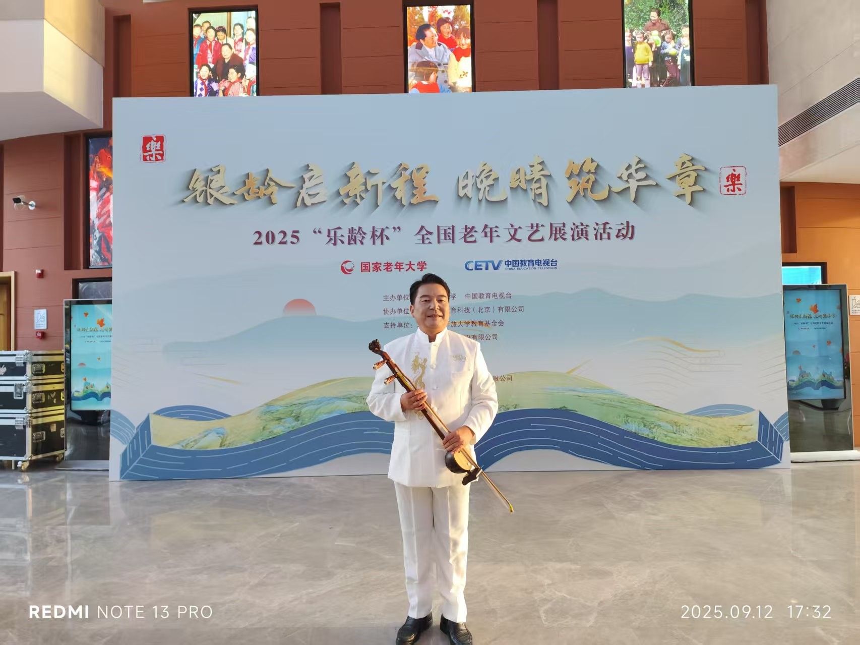 9月12日,2025“乐龄杯”全国老年文艺展演活动在北京圆满落幕。我校老年大学推选的、由离退休职工工作处副处长崔创独奏的《秦腔牌子曲》成功入围全国总展演,并荣获“最佳风采节目”。